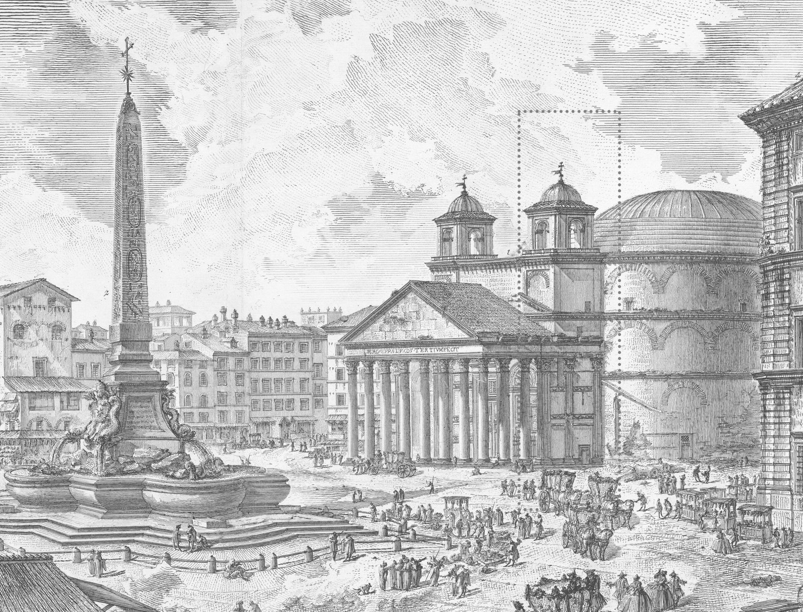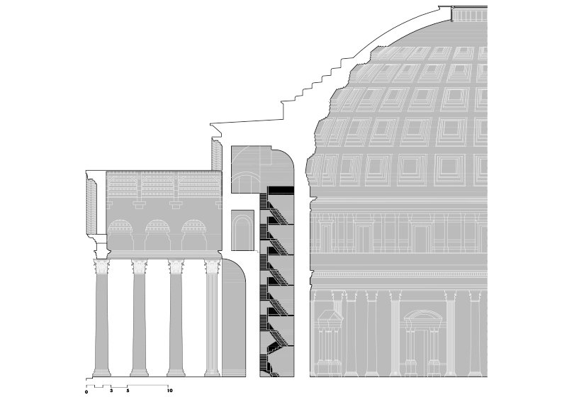 Por contraste, al atravesar el pronaos se accede a un espacio completamente distinto: una gran cella circular cubierta por una cúpula hemisférica perfecta. Una de las características del Panteón es la transición entre el pórtico rectangular a la cella circular. No se trata de una simple yuxtaposición, sino de una conexión dinámica que puede ser entendida como un intersticio que media entre dos formas geométricas fundamentales, y entre el dinamismo urbano y un interior sagrado. En este elemento de conexión, se produce un espacio aparentemente residual en planta, que adquiere una importancia arquitectónica determinante. Se trata de una crujía de transición, con forma trapezoidal en planta, que no solo resuelve el encuentro entre geometrías disímiles, sino que alberga dos escaleras de base triangular que asciende a la cúpula del Panteón.