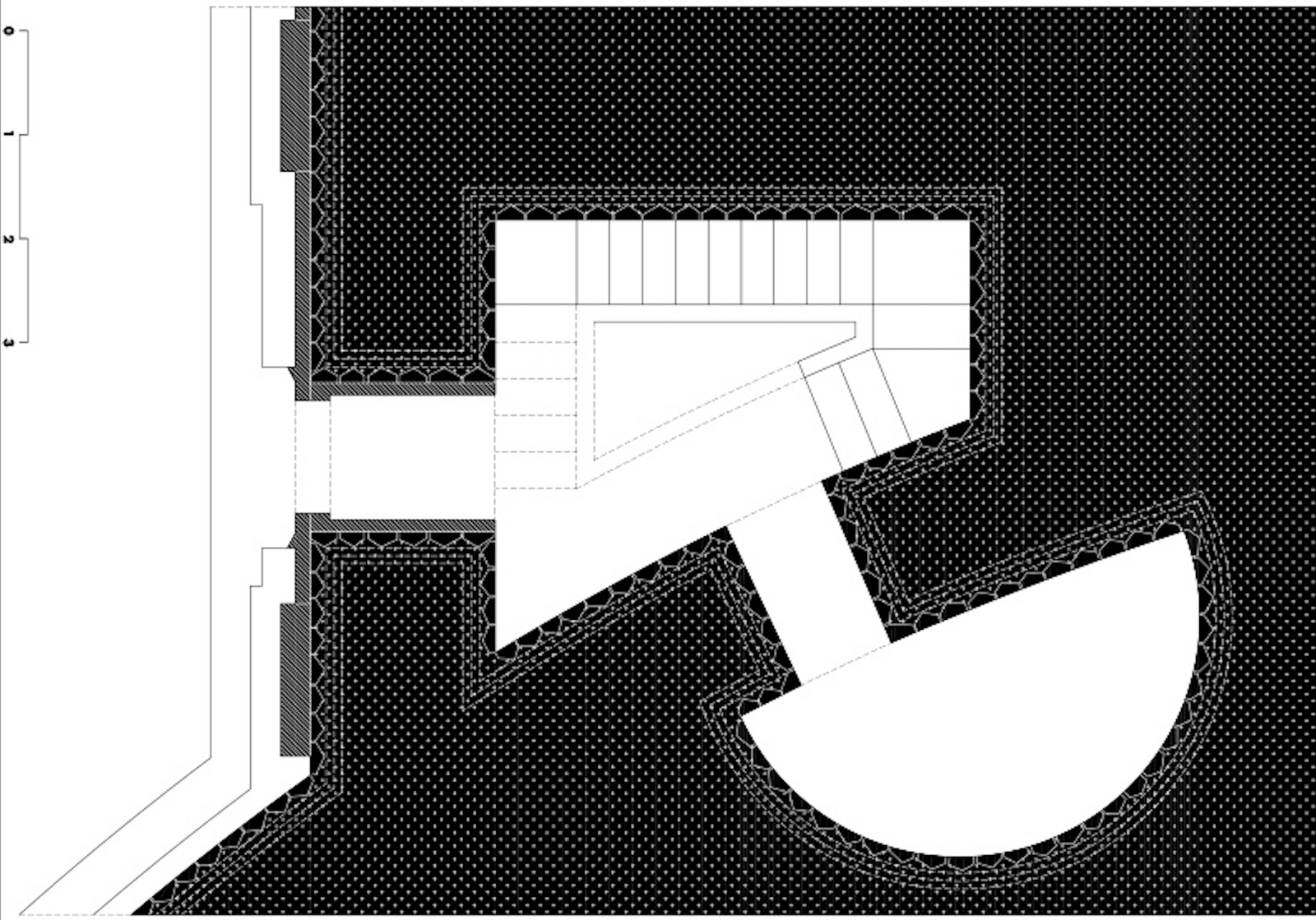 Estas escaleras trasladan al visitante desde el mundo exterior, lineal y ordenado, al mundo interior, absoluto y celestial, y a la cubierta de la estructura. El visitante asciende, no solo en términos topográficos, sino espirituales, hacia un estado de contemplación, de integración con un orden superior que se manifiesta en la pureza geométrica de la gran cúpula y su óculo, por el que penetra la luz como símbolo del conocimiento divino.