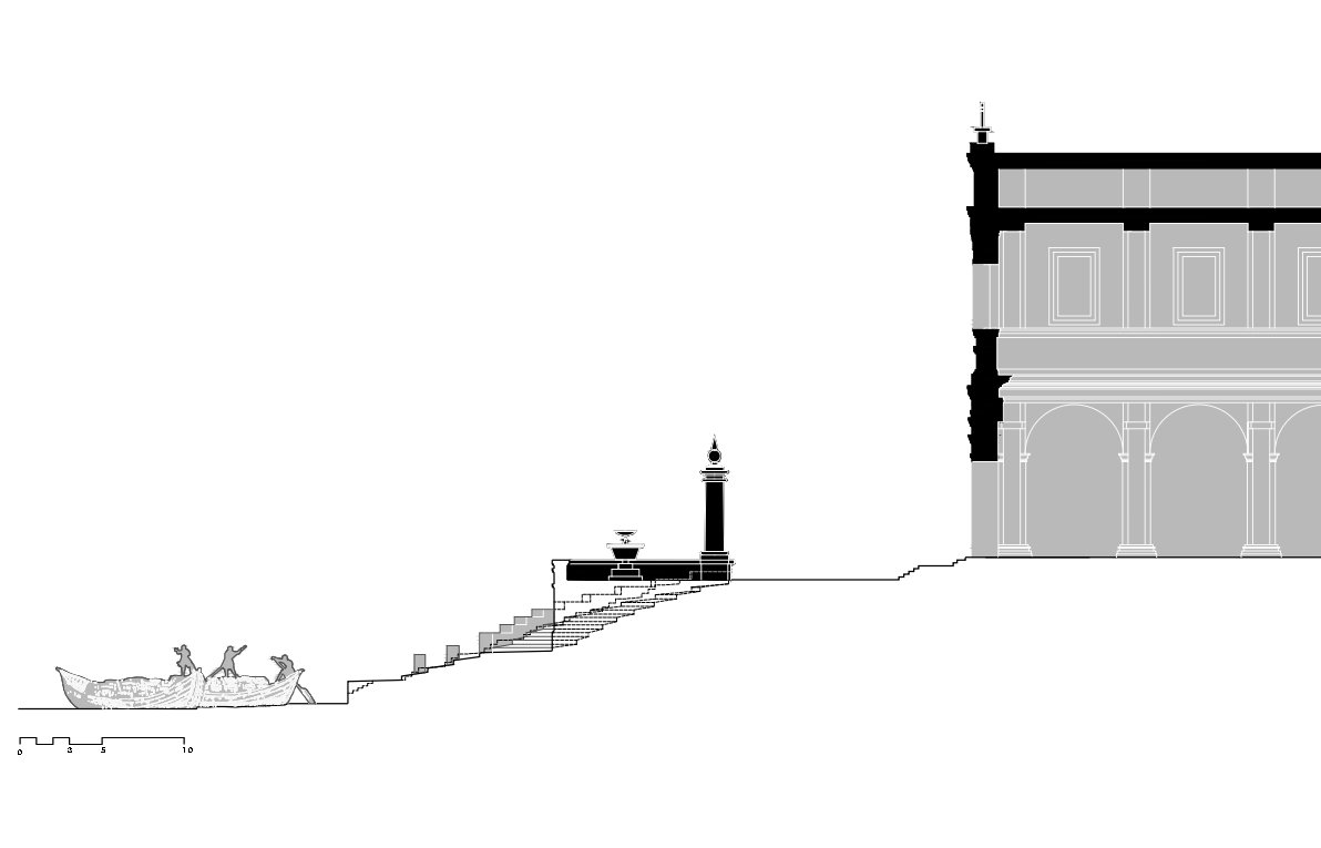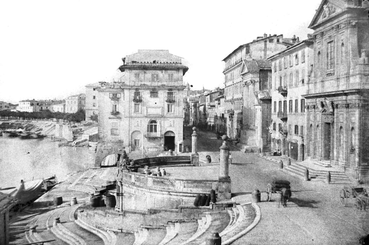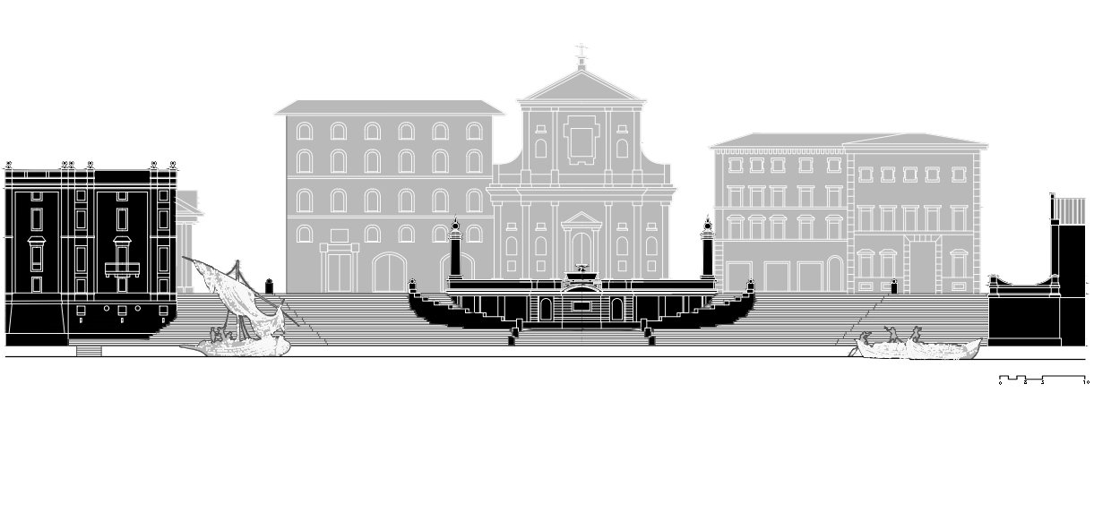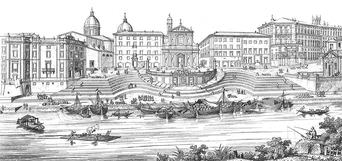 Desde un punto de vista técnico, uno de los mayores desafíos consistió en domesticar un borde fluvial que nunca había tenido una condición estable ni una cota fija de trabajo. El Tíber, a diferencia de otros ríos urbanos europeos, presentaba oscilaciones estacionales muy acusadas, capaces de elevar el caudal varios metros en cuestión de horas. Specchi, formado en el entorno de los Fontana —familia estrechamente vinculada a obras hidráulicas, canales y dispositivos de control de aguas en Roma—, diseñó la escalinata como una estructura en gradientes superpuestos que permitía que diferentes niveles del conjunto siguieran siendo operativos según la altura del agua. La parte inferior, resolviendo un hemiciclo casi a nivel de la lámina, actuaba como muelle de uso inmediato en condiciones de caudal bajo y medio. A medida que el Tíber ascendía, zonas superiores de la escalinata (más elevadas, apoyadas sobre muros de carga reforzados) servían como plataformas alternativas de atraque o como lugares seguros para la descarga manual.