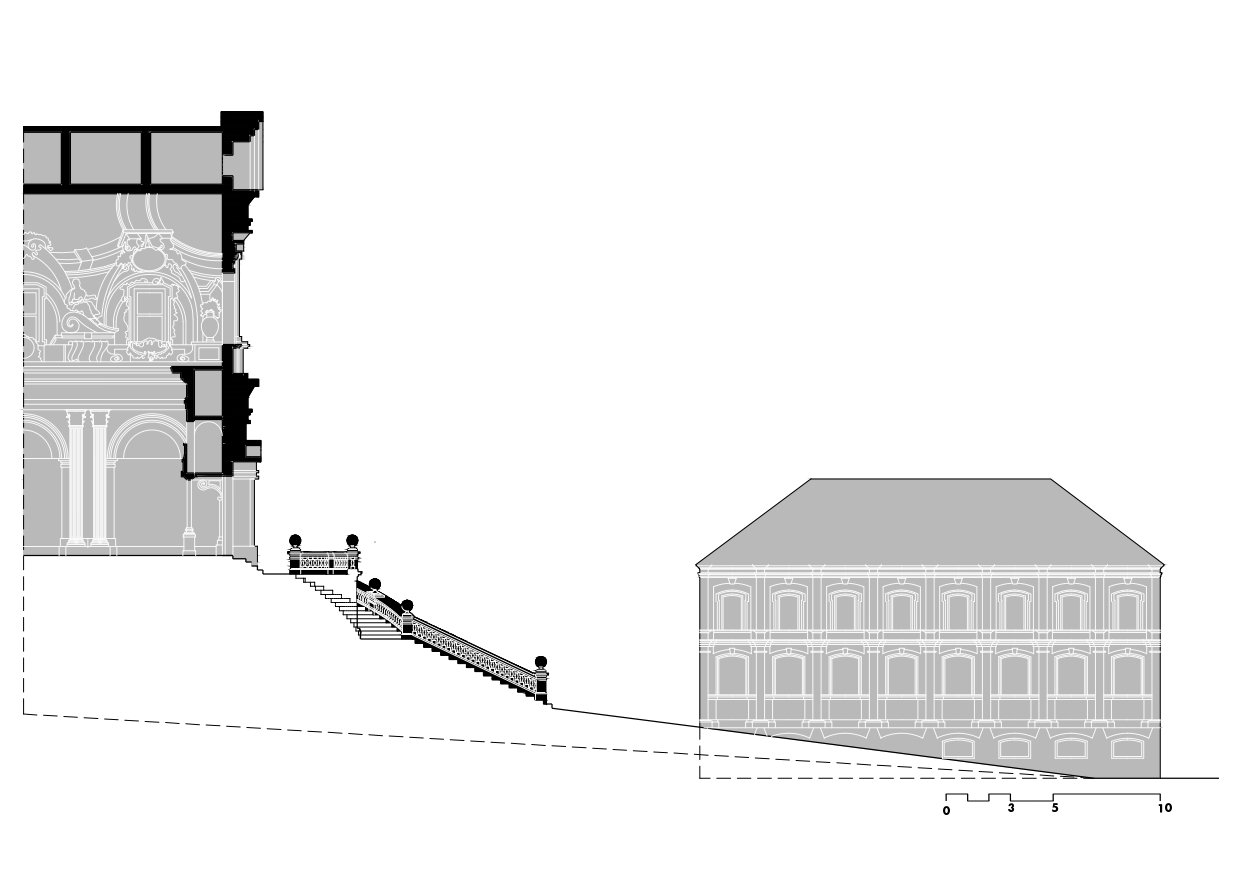 La iglesia de los Santi Domenico e Sisto ocupa un emplazamiento con antecedentes medievales (Santa Maria a Magnanapoli), y su construcción se desarrolló a lo largo de casi un siglo a partir de 1569 bajo la iniciativa del papa Pío V y la intervención sucesiva de distintos arquitectos: Giacomo della Porta (plan inicial), Nicola Torriani (parte inferior) y, en las fases finales, Vincenzo della Greca (y su hijo Felice) en la elevación de la fachada barroca. La escalera exterior, la amplia scalinata de acceso en doble rampa que culmina en una terraza elíptica ante la fachada, fue construida en la década media del siglo XVII y se atribuye en las fuentes a Orazio Torriani en 1654, si bien las variantes formales curvas y la resolución en terrazas se asocian también a la intervención de los della Greca; en síntesis, la escalinata responde a un proceso compositivo colectivo propio de las obras romanas de largo periodo.