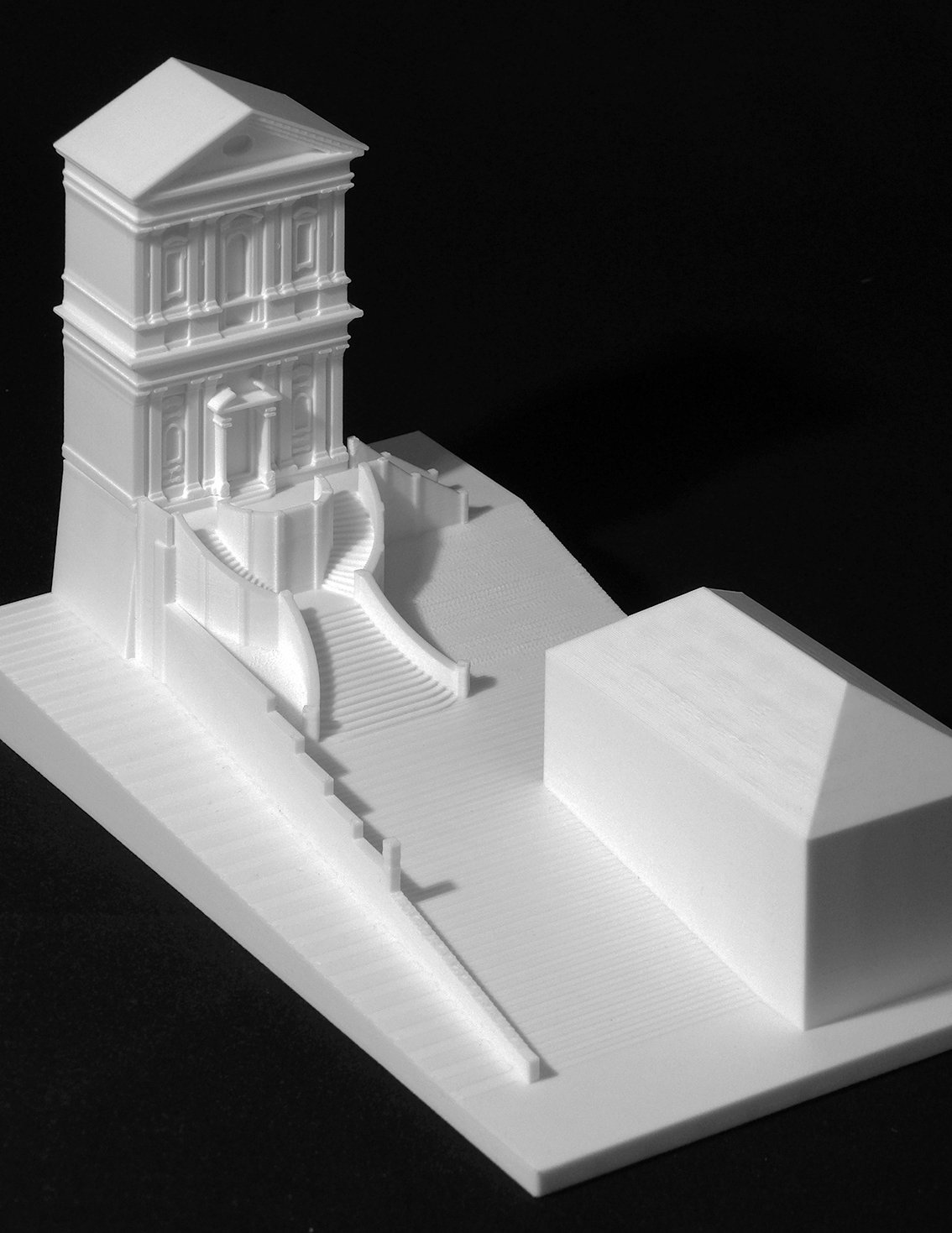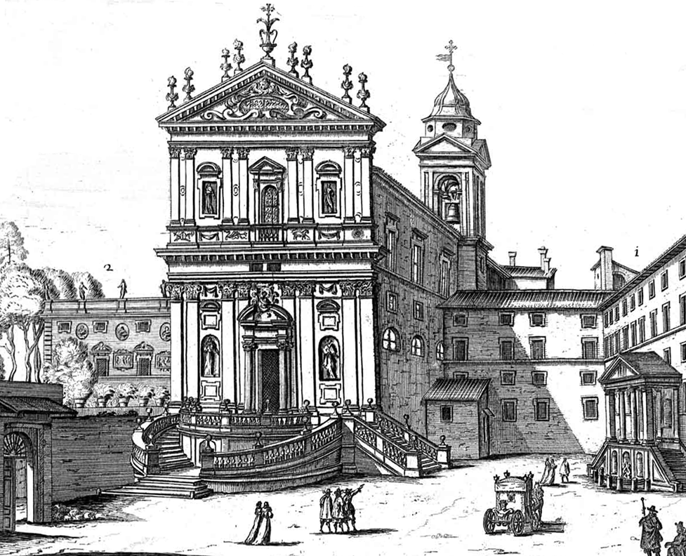 El emplazamiento sobre el Quirinal condiciona la necesidad de articular un acceso que salve el desnivel entre la cota de la calle y la plataforma de la iglesia. Más allá de la mera respuesta física al desnivel, la scalinata proyecta la iglesia hacia el espacio urbano: crea un proscenio que domina la plaza Largo Angelicum y la torre vecina, la Torre delle Milizie, convirtiendo el acceso en un recorrido teatralizado. En el contexto barroco, la escalera exterior se concibe deliberadamente como “escenario” para la aparición del templo, una puesta en escena progresiva que prepara al fiel y al visitante para el umbral sagrado, y como mediadora entre lo público y lo religioso. Estudios sobre escaleras monumentales destacan esta doble función utilitaria y representativa, como rasgo recurrente de la arquitectura ceremonial.