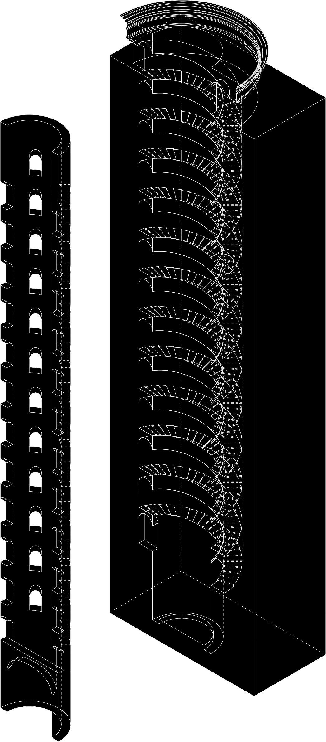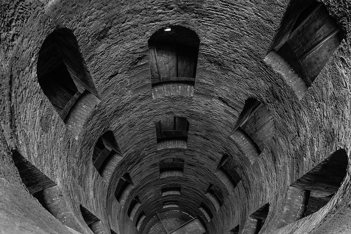 Materializado entre 1527 y 1537, el Pozzo di San Patrizio se configura como una estructura cilíndrica excavada en el tufa volcánico que caracteriza el relieve de Orvieto, con una profundidad de aproximadamente 53 metros y un diámetro de 13 metros. Esta forma cilíndrica se articula mediante dos escaleras helicoidales independientes que envuelven el eje central del pozo y permiten la circulación bidireccional de personas y animales de carga sin intersección. Cada escalera consta de 248 peldaños iluminados por setenta ventanas dispuestas a intervalos regulares, que modulan la entrada de luz y ventilación en el espacio subterráneo.