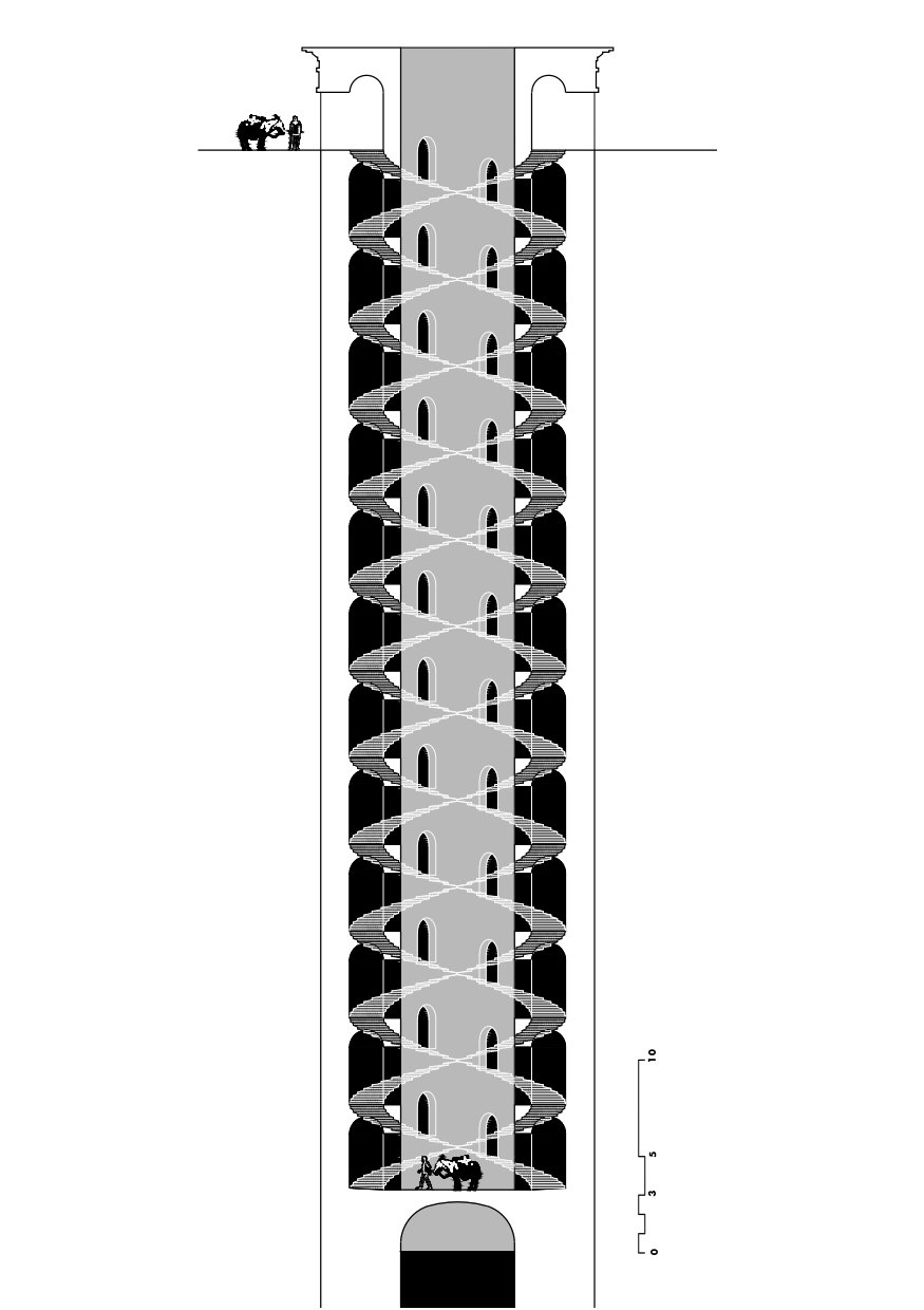 La solución de la doble hélice remite directamente a una lógica funcional: la necesidad de transportar agua desde el fondo del pozo hasta la superficie de manera continua y eficiente, sin interferencias de tráfico, lo cual se logra evitando que los animales que descendían con recipientes vacíos se cruzaran con los que ascendían con recipientes llenos. Esta disposición no es arbitraria, sino que encuentra un antecedente conceptual en las escaleras de doble hélice como la del Bramante Staircase en el Vaticano, donde la separación de flujos circulatorios responde a soluciones logísticas complejas (diseñadas originalmente para diferentes tipos de circulación vertical).