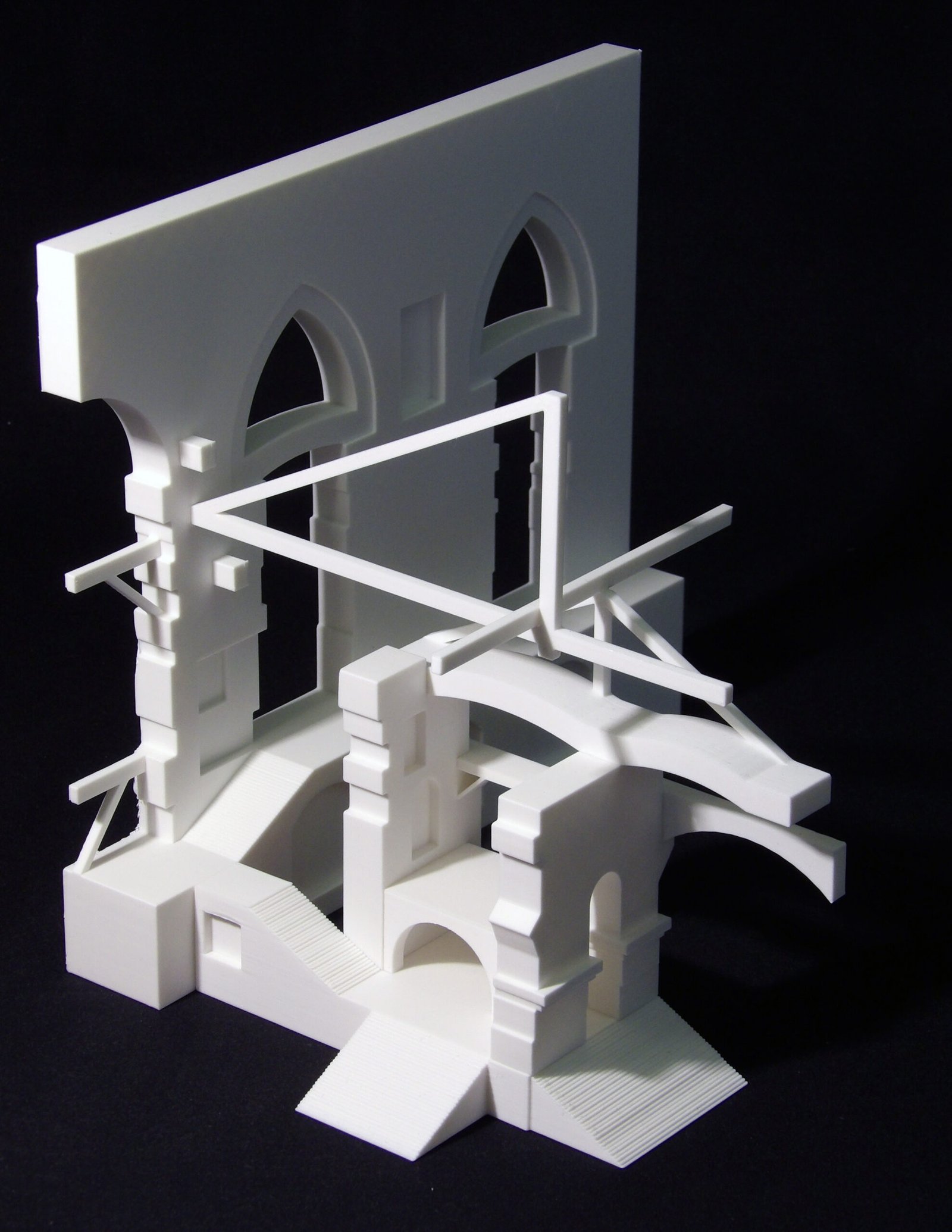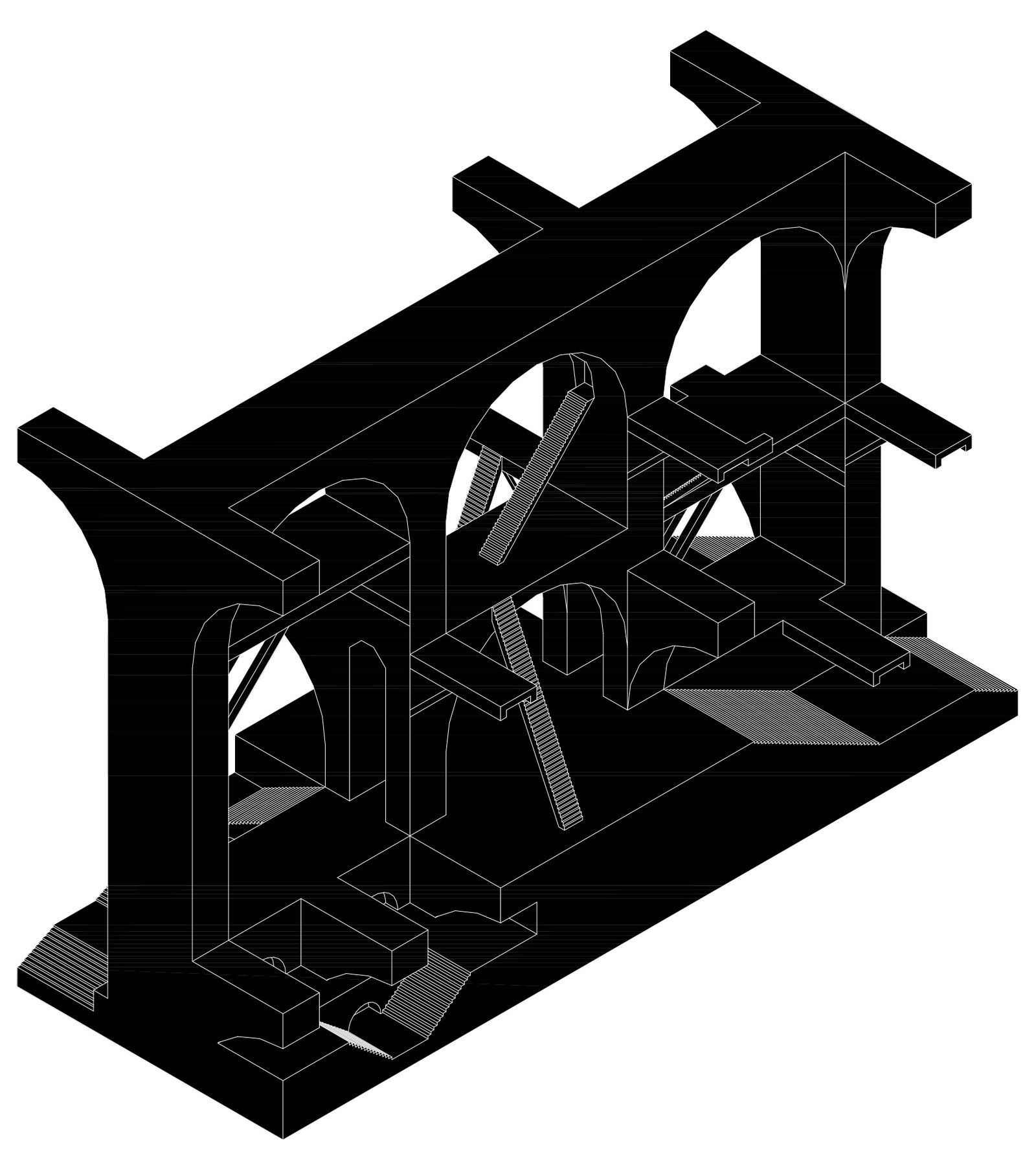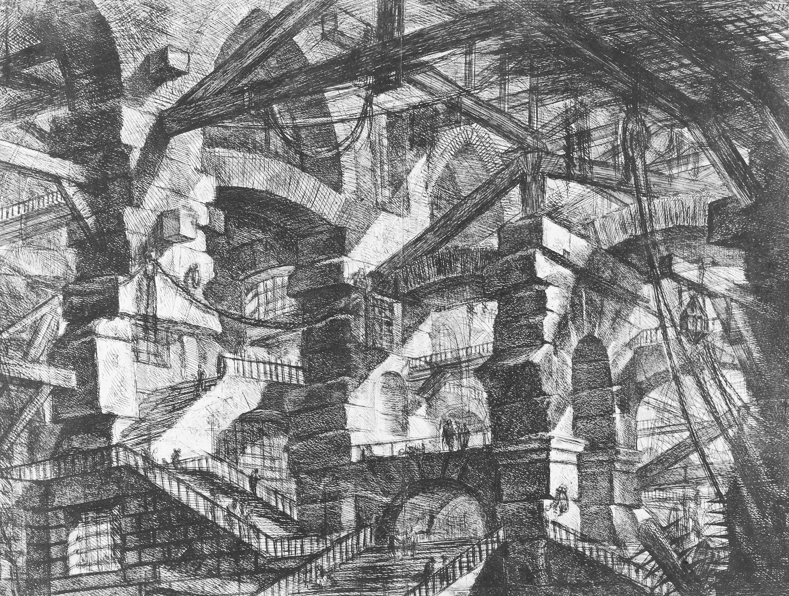 En el grabado XIV, El arco gótico, la prisión se abre hacia una trascendencia ilusoria. La presencia del arco apuntado introduce una nostalgia de lo sagrado, una promesa de salida que nunca se cumple. Las escaleras se enredan alrededor de este umbral, lo circundan sin alcanzarlo, como si presintieran que más allá de ese arco no hay liberación, sino otro recinto del mismo laberinto. Piranesi construye aquí una metáfora de la condición humana: el deseo de elevarse hacia la luz y el peso de la materia que arrastra de nuevo hacia la oscuridad. El arco gótico se erige como el ojo de una aguja imposible, un símbolo de la tensión entre el cuerpo y el espíritu, entre el anhelo de infinito y la certeza del encierro.