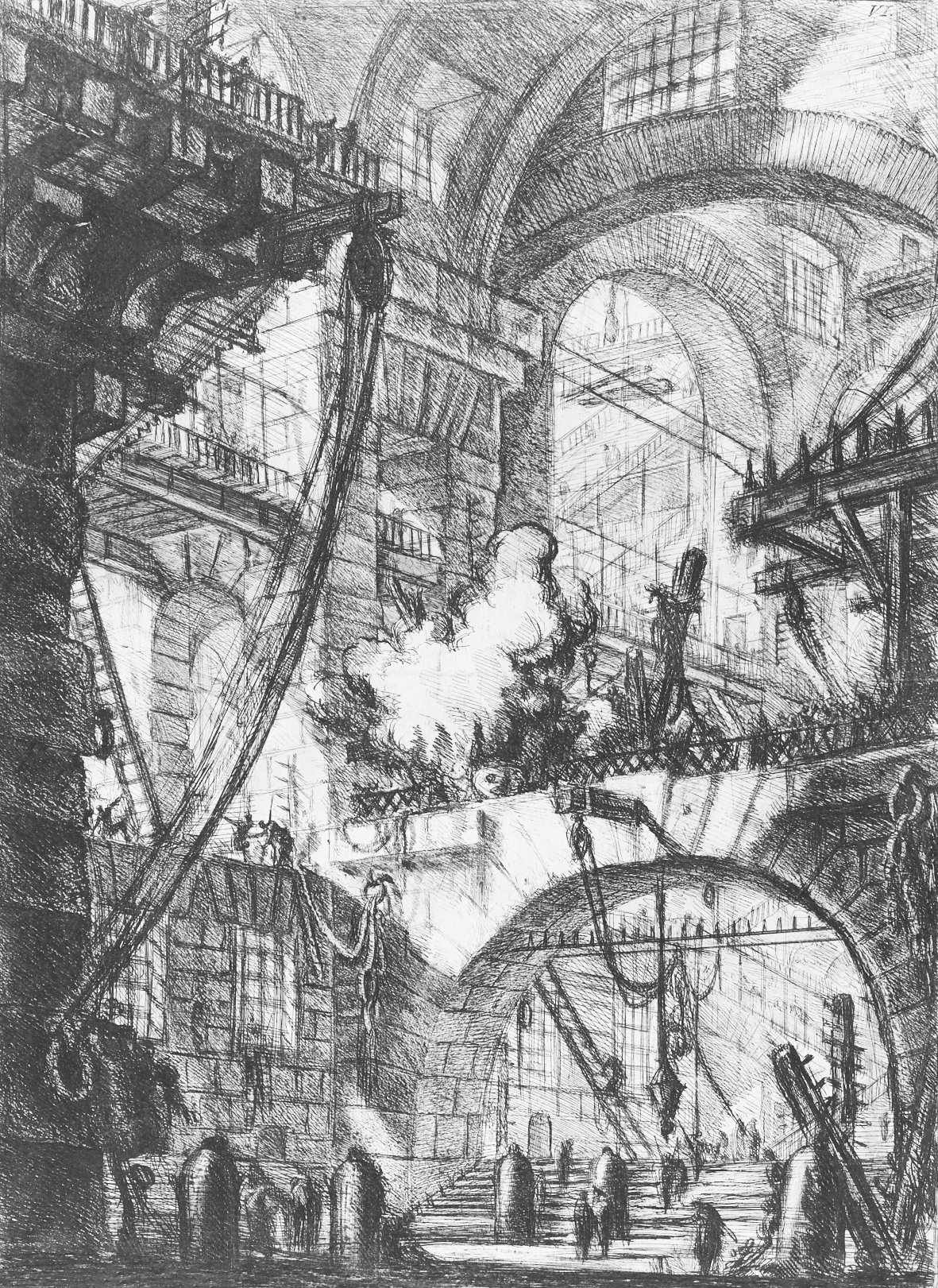 En el grabado VI, El fuego humeante, Piranesi despliega un espacio gobernado por un resplandor que no ilumina del todo. En el centro, un fuego exhala un humo espeso que asciende entre escaleras y arcadas. El ojo del espectador, guiado por los haces de luz, intenta seguir el curso de las rampas, pero se pierde en su laberinto. Allí, el fuego parece el corazón de una revelación inalcanzable: la fuente del conocimiento y, al mismo tiempo, del castigo. Las escaleras que se acercan a él arden simbólicamente en su propia contradicción: avanzar hacia la luz es también hundirse en la sombra. Piranesi logra que el espacio, construido con precisión casi matemática, se disuelva en una atmósfera de incertidumbre. Lo sólido se vuelve ilusorio; la arquitectura se convierte en respiración, en humo.