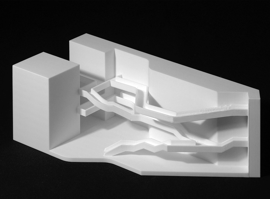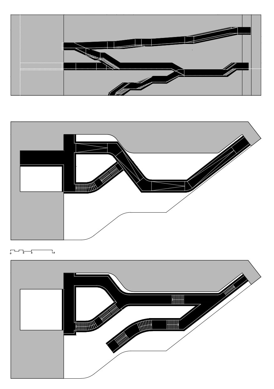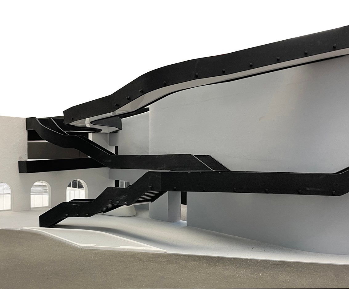 Esta concepción activa del espacio museístico se manifiesta de manera especialmente intensa en el gran hall central, auténtico núcleo conceptual del proyecto. Más que un vestíbulo convencional, este espacio funciona como un vacío articulador en el que convergen rampas, pasarelas y escaleras suspendidas, conectando los distintos niveles y recorridos del edificio. El hall no solo distribuye, sino que expone el movimiento, convirtiendo la circulación en espectáculo y en principio organizador del conjunto.