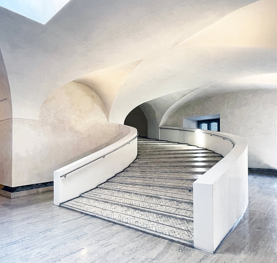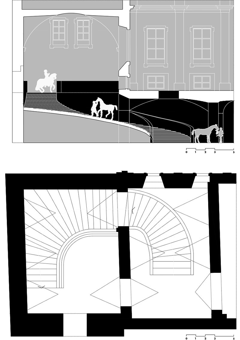 En el vasto conjunto arquitectónico del Palazzo del Quirinale en Roma, las Scuderie Papali constituyen un ejemplo paradigmático de la síntesis entre funcionalidad, monumentalidad y técnica en la arquitectura de la Roma barroca. Concebidas para alojar las caballerizas papales, las Scuderie incorporaron una solución espacial de notable ingenio: una rampa-escalera que permitía el tránsito vertical de caballos y carruajes entre distintos niveles del edificio, extendiendo así la capacidad funcional de las caballerizas a lo largo de dos plantas. Este recurso resolvía un problema logístico esencial —el desplazamiento de animales en un terreno de pronunciada pendiente— al tiempo que mantenía una dignidad formal acorde al entorno palaciego.