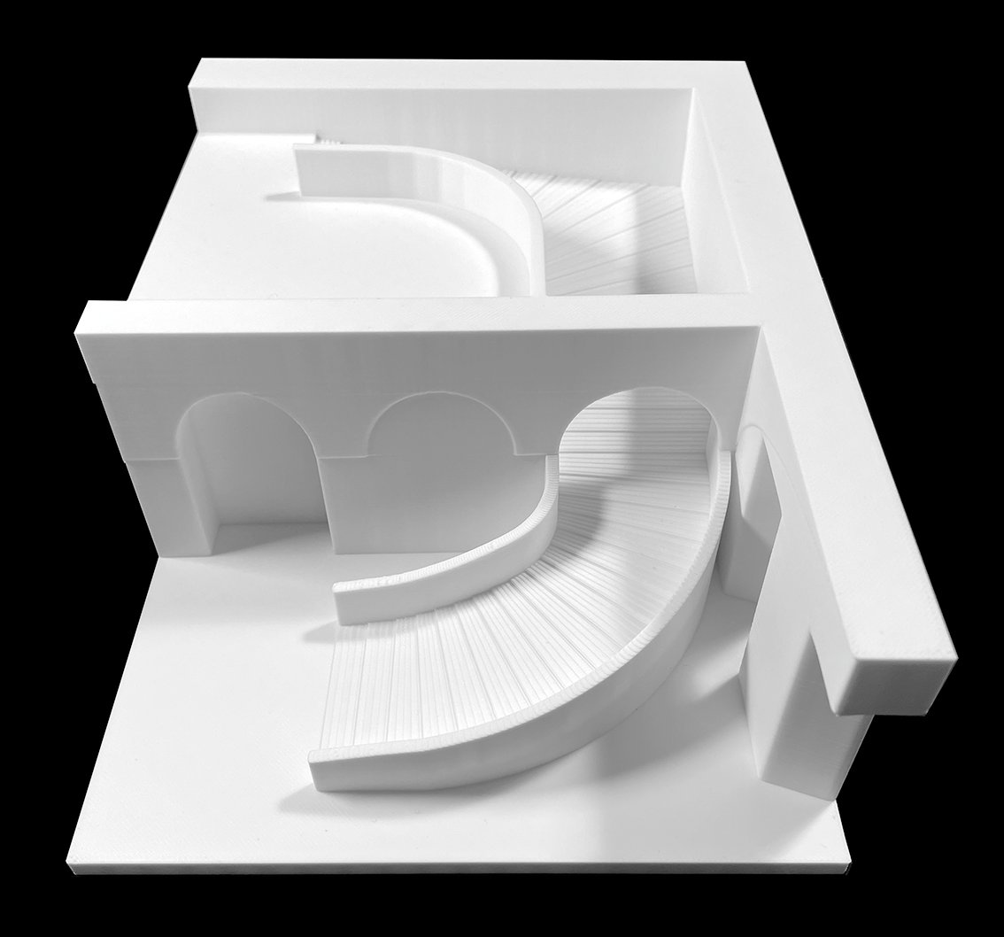Esta anécdota subraya una continuidad conceptual que atraviesa siglos de historia arquitectónica: la rampa como dispositivo de control del movimiento, donde la arquitectura no solo contiene sino que coreografía la circulación. En la rampa del Quirinal, la curva suave y la luz medida ordenan el avance del caballo; en la de Bramante, la espiral ascendente expresa la jerarquía del poder papal; en Le Corbusier, la pendiente se convierte en instrumento de percepción, en recorrido que une los planos de la vida moderna. Por tanto, la rampa-escalera de la Scuderia del Quirinal no puede entenderse solo como un elemento utilitario. Es una manifestación temprana de una arquitectura del movimiento —una arquitectura que articula la relación entre cuerpo, animalidad y espacio—, cuya herencia llega hasta el siglo XX. Su estudio revela que la racionalidad constructiva de los siglos XVII y XVIII no se oponía al simbolismo, sino que lo incorporaba en la forma misma de la función. La rampa del Quirinal es así una pieza bisagra: una estructura pensada para el caballo que anticipa las preocupaciones modernas por la circulación continua, la eficiencia y la experiencia del recorrido.