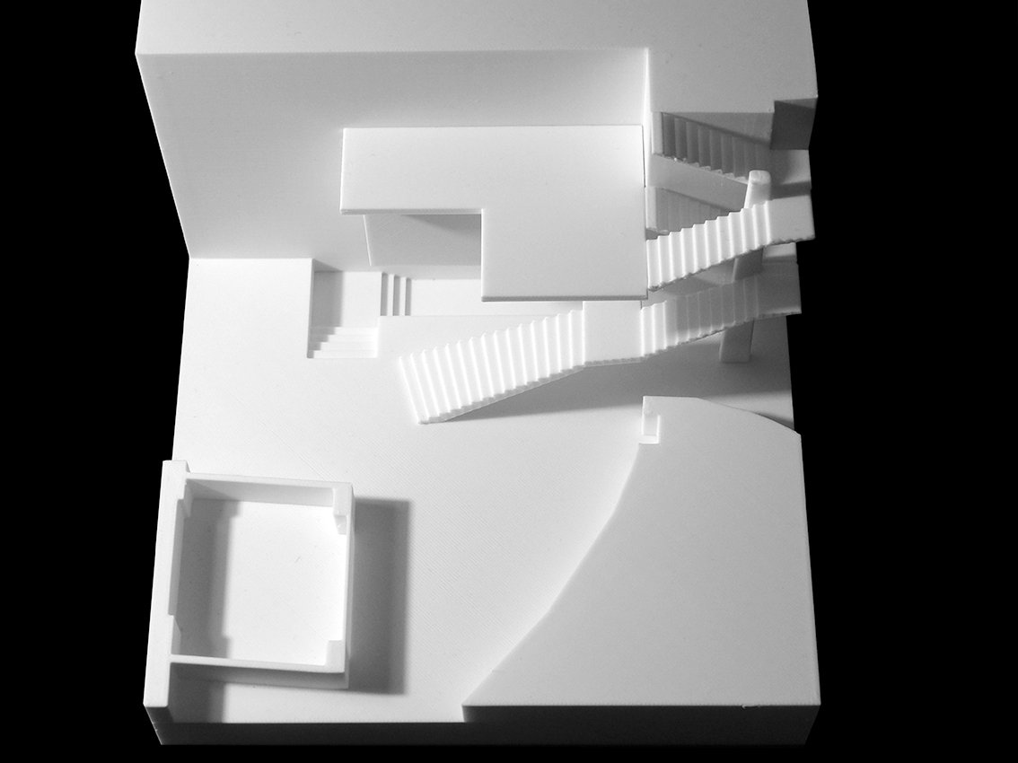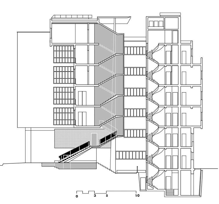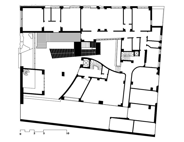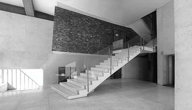La escalera se sitúa en el corazón del edificio y se hace visible desde la ciudad a través de la profunda hendidura vertical que recorre la fachada principal. Este gesto no es meramente compositivo: al exponer el núcleo de circulación, Moretti convierte el recorrido vertical en un elemento representativo, casi ceremonial. La escalera deja de ser un espacio residual para convertirse en un lugar de transición cuidadosamente coreografiado, donde el movimiento del cuerpo, la entrada de la luz y la percepción de la estructura se integran en una experiencia continua. Desde el acceso, el visitante es conducido a través de un espacio que combina apertura y control, ligereza y monumentalidad.